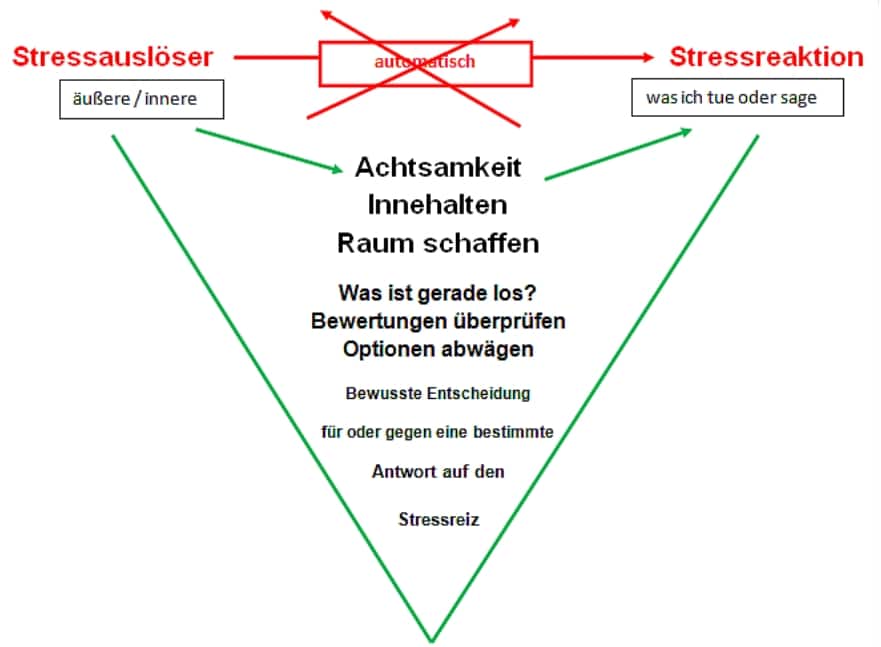 Wir lernen durch Achtsamkeit unsere gewohnten Gedanken, Gefühle und unser Verhalten im Umgang mit innerem oder äußerem Stress kennen.